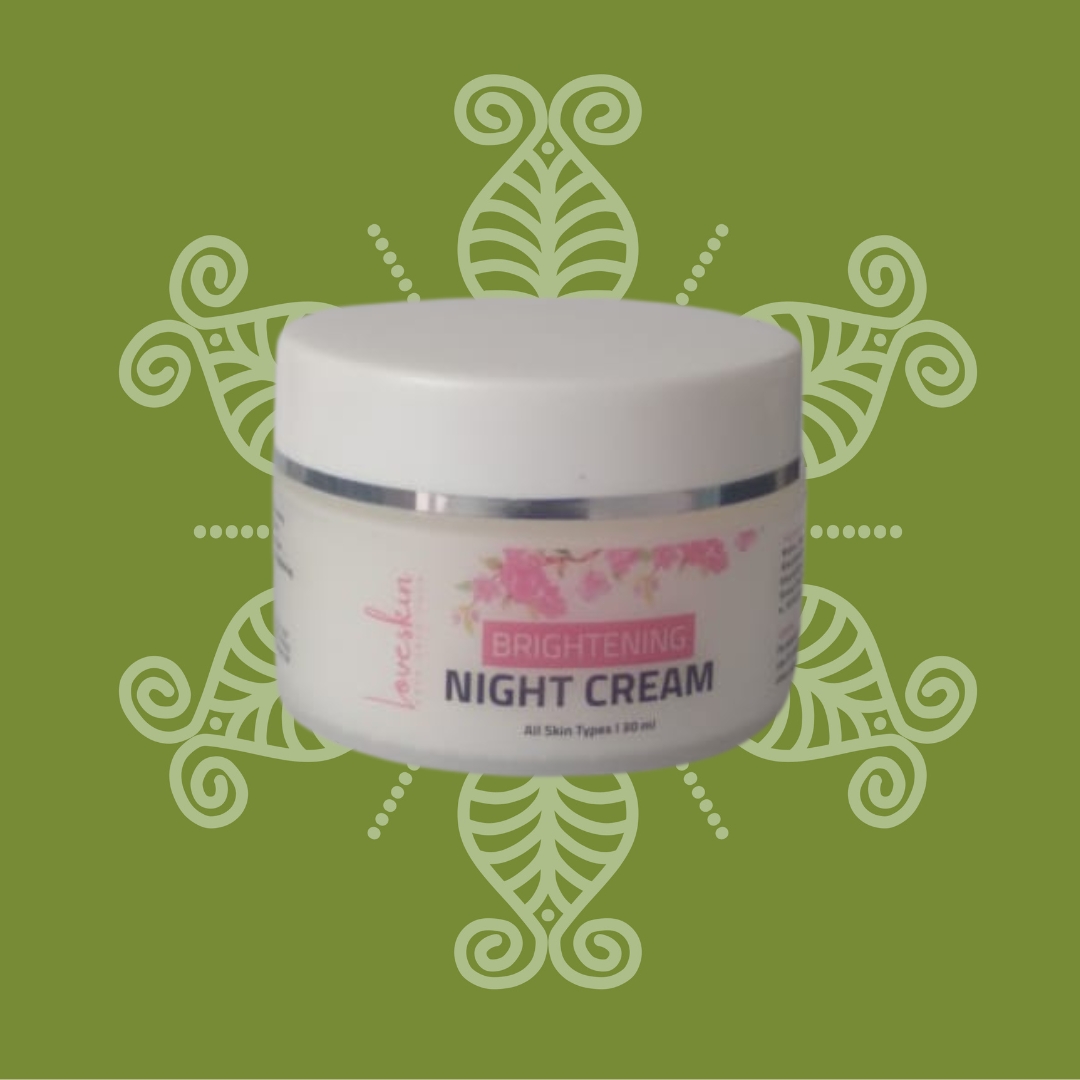 LoveSkin Brightening night cream is specially formulated with safe ingredients that helps in visibly Brighten skin in a 4 weeks. boost your natural glow & moisturise the skin deeply. Gradually lighten the skin, rich in whitening & glowing ingredients. Reduce discolorations & dulness, fine Lines & Wrinkles. Keeps your skin fair & Lovely.